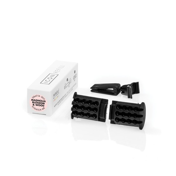 con es el ambientador para coche Millefiori® , que se puede colocar fácilmente tanto en vertical como en horizontal gracias a un funcional clip. Con el paso del aire, Icon difundirá un delicado aroma en su automóvil. Recarga disponible