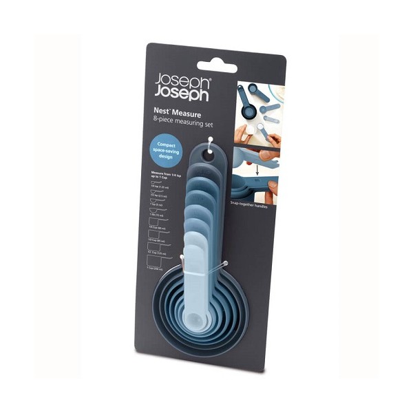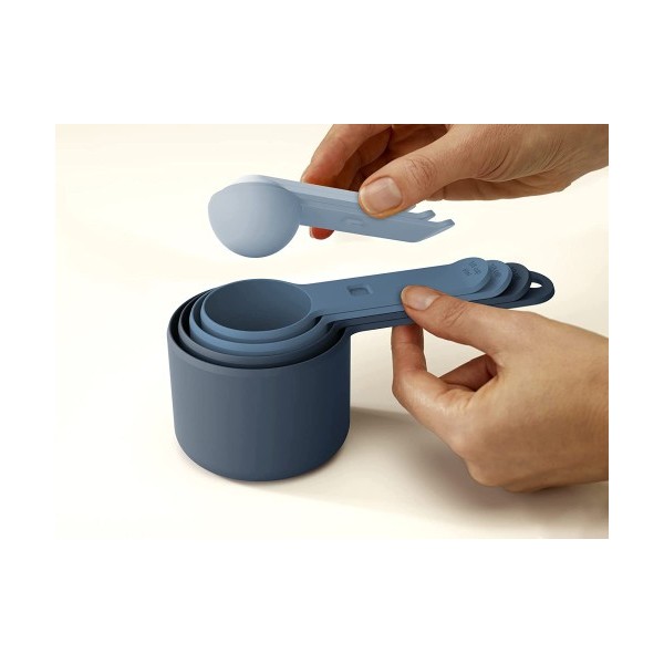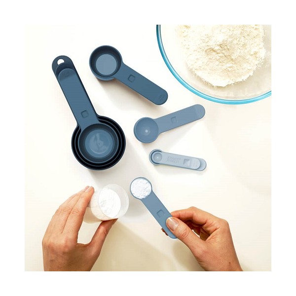 Se enganchan para guardar sin que se separen. Los mangos tienen un código de color para indentificar facilmente la medida. Mangos antideslizantes suaves y cómodos. El juego incluye enrasador y 6 cucharas. Medidas de 1T (15 ml) hasta 1/8 tsp (0,60 ml).