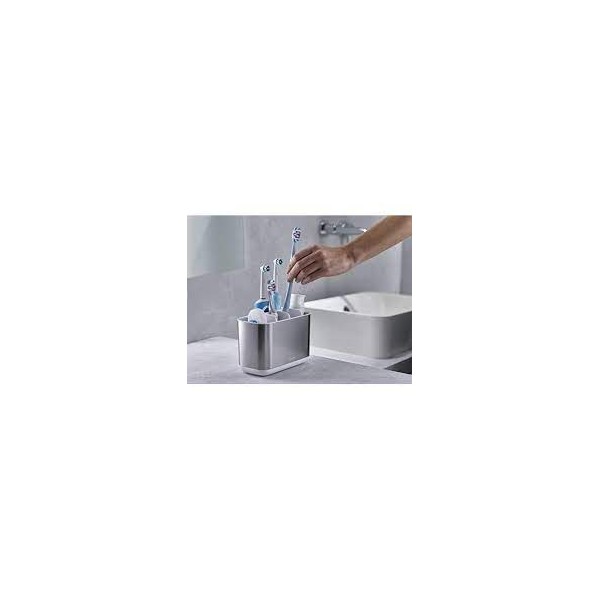 El portaescobillas queda abierto hasta reinsertar la escobilla Cabezal cónico y cerdas en ángulo para una limpieza profunda Bandeja de goteo con ranuras de ventilación para un secado rápido Disponibles cabezales de recambio Color blanco