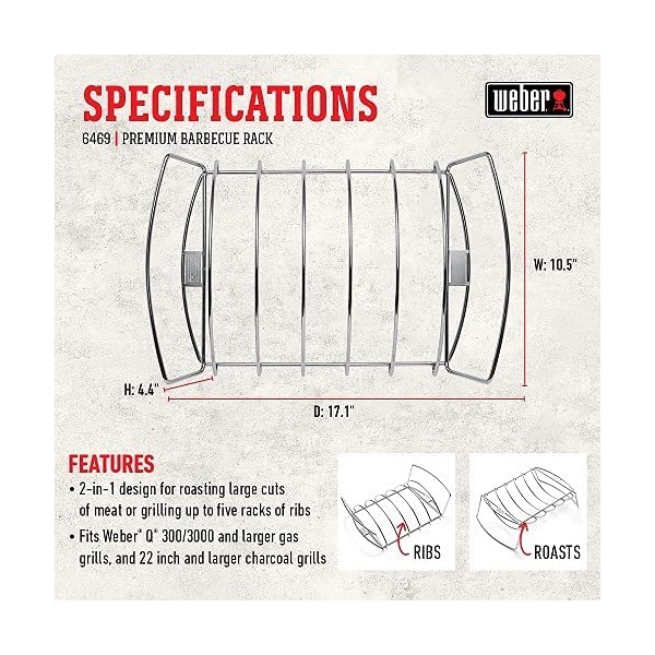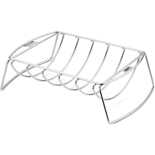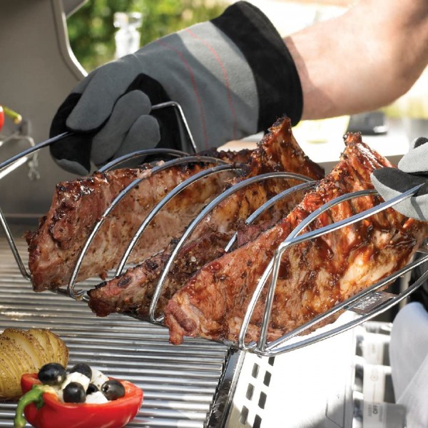Tierna carne que se desprende del hueso, lista para disfrutarla. Exquisita carne asada con sabores que sólo el humo que se acumula bajo la tapa de una barbacoa puede lograr. El diseño “2 en 1” del soporte para asados Premium ofrece capacidad para varios costillares, lo que aumenta el espacio disponible en las rejillas de cocción, y puede usarse además como una robusta base para jugosas carnes asadas.