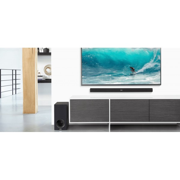 La DHT-S316 de Denon convierte cualquier televisor en un centro de entretenimiento doméstico. Esta barra de sonido de tamaño compacto montable en pared proporciona un sonido de alta fidelidad con altavoces de dos vías y un subwoofer inalámbrico.La tecnología de surround virtual Denon crea una experiencia de cine en casa potente y realista con decodificación Dolby Digital y DTS y el exclusivo optimizador de diálogos Denon, que garantiza diálogos claros a cualquier volumen. El televisor se conecta fácilmente por HDMI (con canal de retorno de audio) por medio del cable HDMI suministrado. Una entrada óptica permite conectar un dispositivo adicional. Y puedes emparejar de forma inalámbrica tus dispositivos Bluetooth con la DHT-S316 para transmitir fácilmente tu música favorita.