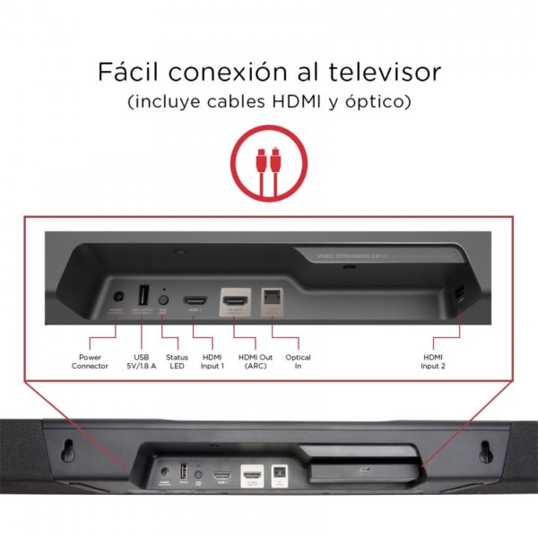 Los cables HDMI de alta velocidad y ópticos incluidos permiten la configuración rápida y sencilla y el diseño de perfil bajo de 2" no tapará la pantalla de su TV.