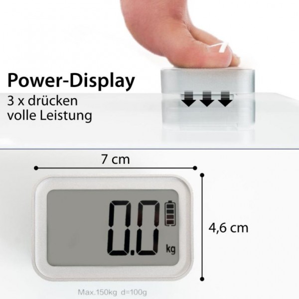 Presionar la pantalla; brevemente y con fuerza tres veces, se activa el principio de dinamo cinético de la báscula de baño Kira