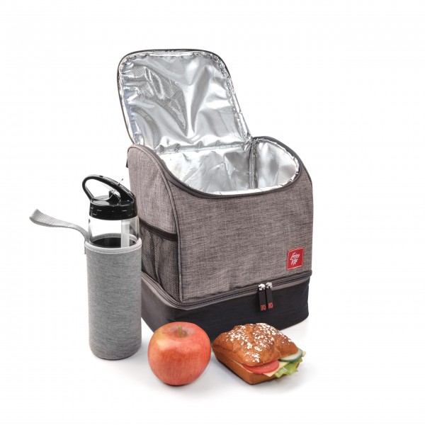 Bolsa flexible y ligera de diseño moderno. Interior aislante. Bolsillos internos y externos. Apertura total para mejor accesibilidad y limpieza. Cinta colgadora extensible. Fácil de almacenar. Incluye dos contenedores (0,75L + 0,5L).