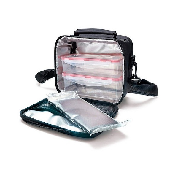Bolsa flexible y ligera de diseño moderno. Interior aislante. Bolsillos internos y externos. Apertura total para mejor accesibilidad y limpieza. Cinta colgadora extensible. Fácil de almacenar. Incluye dos contenedores (0,75L + 0,5L).