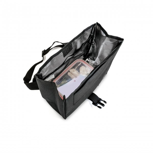Bolsa flexible y ligera de diseño moderno. Interior aislante. Bolsillos internos y externos. Apertura total para mejor accesibilidad y limpieza. Cinta colgadora extensible. Fácil de almacenar. Incluye dos contenedores (0,75L + 0,5L).