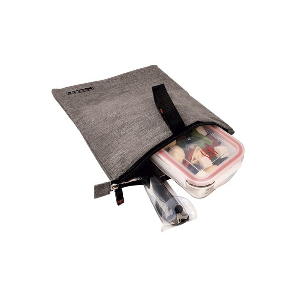 Bolsa flexible y ligera de diseño moderno. Interior aislante. Bolsillos internos y externos. Apertura total para mejor accesibilidad y limpieza. Cinta colgadora extensible. Fácil de almacenar. Incluye dos contenedores (0,75L + 0,5L).