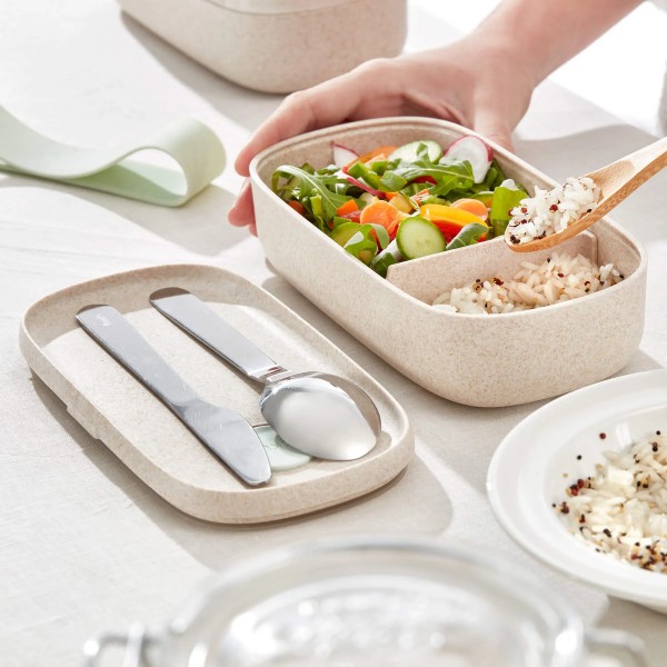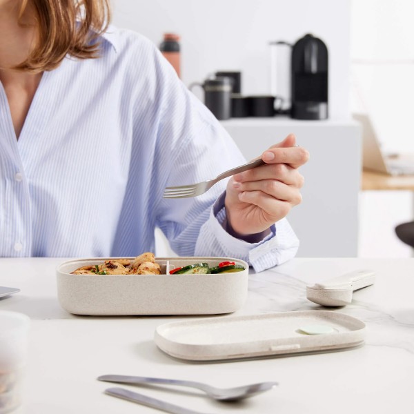 Contenedor de plástico libre de BPA. Incluye dos compartimentos y recipiente para aliños, cubiertos y enfriador incluidos. Capacidad total 1,5 l y recipiente de 75 ml. Apto para lavavajillas. Libre de BPA. Cierre seguro.