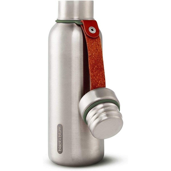 Termo de acero inoxidable con tira de cuero para sujetar el tapón