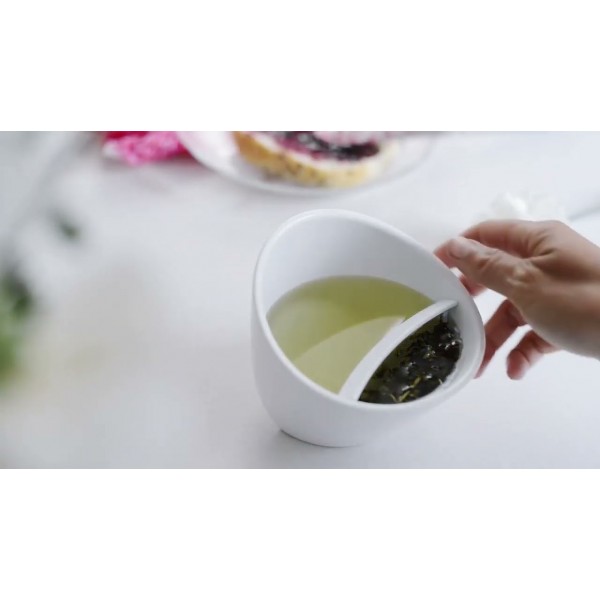 Solo tienes que poner la rejilla en la ranura indicada para ello en el lateral e inclinar la taza hacia ese lado, colocar las hojas de té o de la infusión que quieras y verter agua caliente hasta que las hojas queden cubiertas. Cuando el té adquiera el tono que te gusta, inclina y apoya la taza infusora al otro lado, de forma que la bebida no toque las hojas. Entonces podrás disfrutar tu té mientras las hojas de la infusión desprenden su aroma natural.