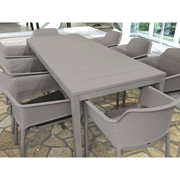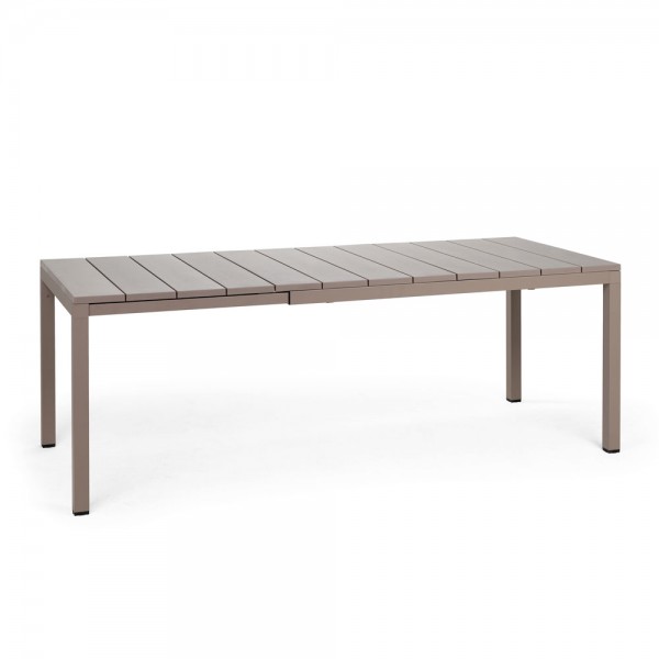 Mesa extensible con tablero DurelTOP en polipropileno tratado anti UV y teñido en masa, patas en aluminio pintado con pies regulables.