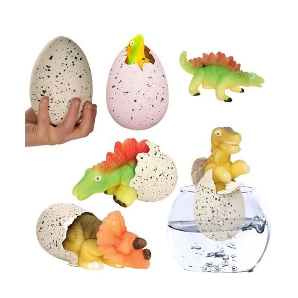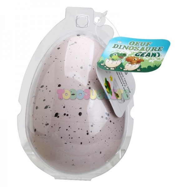 Para mayores de 3 años.Surtido sorpresa, 6 diferentes.Instrucciones de uso:1. Pon el huevo en agua.2. Espera de 24 a 48 h: el huevo se rompe.3. A las 48 h, el dinosaurio ha salido.4. Si lo dejamos sumergido en agua durante 2 ó 3días más, triplica su tamaño.