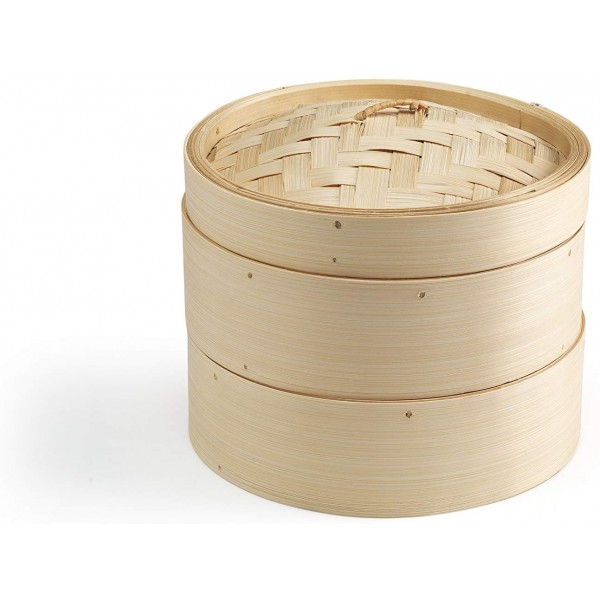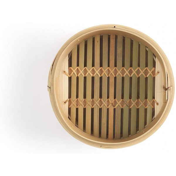 Vaporera de bambú, disponible en dos tamaños, 20 y 25 cm. Limpiar con agua templada jabonosa; aclarar y secar. Acondicionarla con aceite mineral si es necesario.