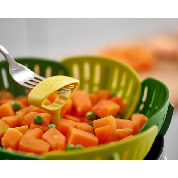 Cocine diferentes tipos de alimentos al vapor por separado. Ganchos integrados para agarrar a la olla. Profundidad mínima de la olla: 8 cm. Tamaño mínimo de la olla para usar los tres 18 cm.