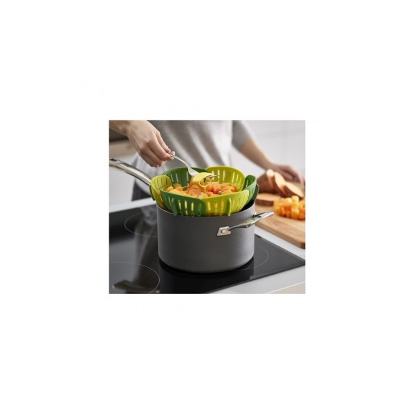 Sus altas patas se abren y cierran para añadir el agua deseadaSu asa “Pop-up”: –Abajo para tapar la cacerola o para guardar en el armario de la cocina –Arriba para extraer cómodamenteCerrado, ocupa muy poco espacio El mango se puede desenroscar para utilizar toda la superficie Apto lavavajillas Medidas: 18x18x8 cm