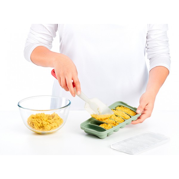 Apto para recipientes anti adherentes. Ajustable de 18 a 23 cms. Resistente al calor. Gancho para facilitar la extracción