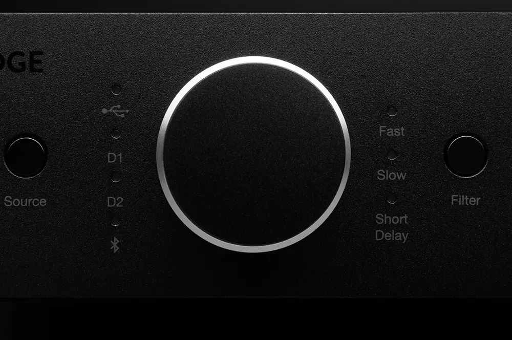 La fascia de aluminio del DacMagic 200M tiene un botón para seleccionar una de las 4 entradas digitales posibles, otro para elegir uno de los 3 filtros digitales que se adapten a tus gustos auditivos y un control de volumen si lo estás usando como amplificador de auriculares. Posee luces LED para confirmar tu entrada y selección de filtros, con luces adicionales que indican la resolución de la música entrante.