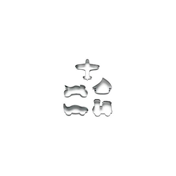 Caja metálica con 5 cortadores metálicos con forma de coche, tren, moto, barco y avión.