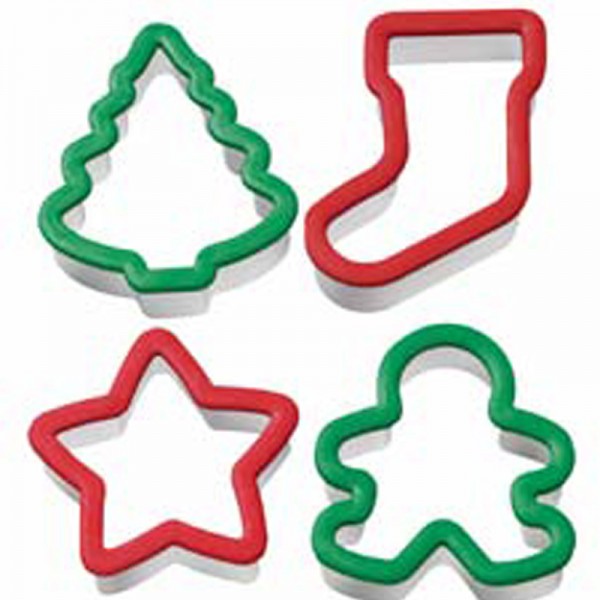 Juego de cuatro cortadores de metal con motivos navideños: árbol, estrella,bota y muñeco de jengibre.