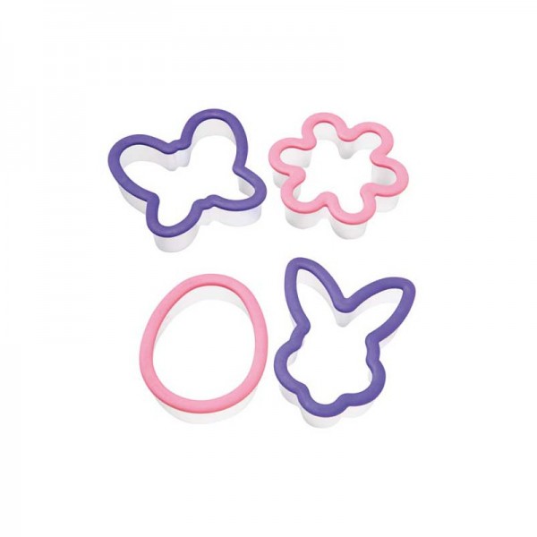 Juego de tres cortadores de metal con motivos de pascua: mariposa, huevo,flor y conejo.