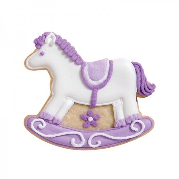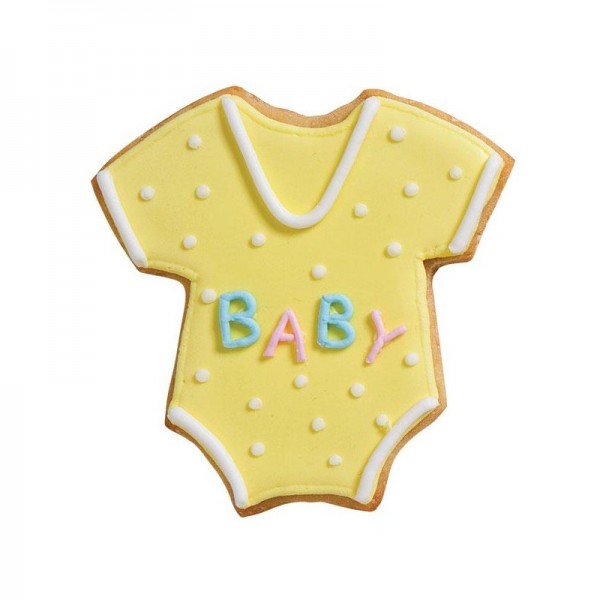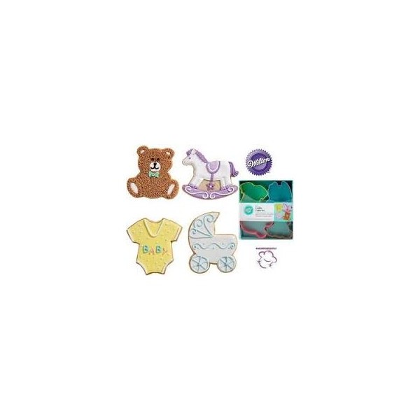Juego de cuatro cortadores de metal con motivos de bebe: carrito, caballito, body y osito.