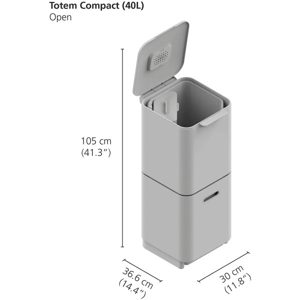 Los respiraderos en los laterales de los cubos facilitan la retirada de las bolsas llenas. Totem también cuenta con un filtro antiolor ventilado en la tapa principal que ayuda a reducir la humedad y el olor que se acumulan por la basura. El diseño incluye un cubo de residuos alimentarios extraíble de 3 litros con tapa que se puede colocar en cualquier compartimento o en la encimera.