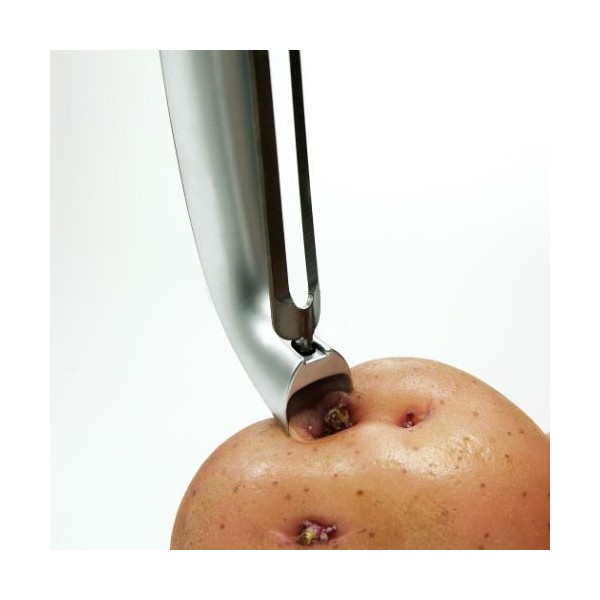 Cortador de metal afilado, integrado en el propio pelador para eliminar los "ojos" de las patatas y otras imperfecciones.