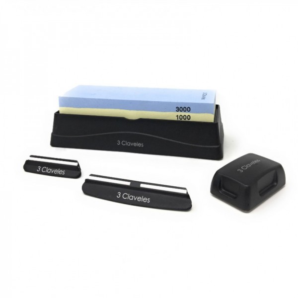 Incluye: dos guías de afilado (para cuchillos pequeños y grandes), reparador para limpiar y alisar la piedra, y almacenaje interno.