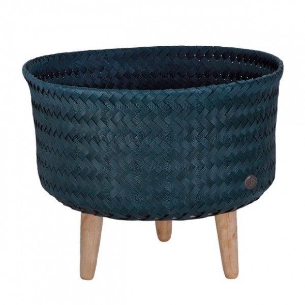 Precioso cesto polivalente hecho con un cesto y tres patas de madera de canela.