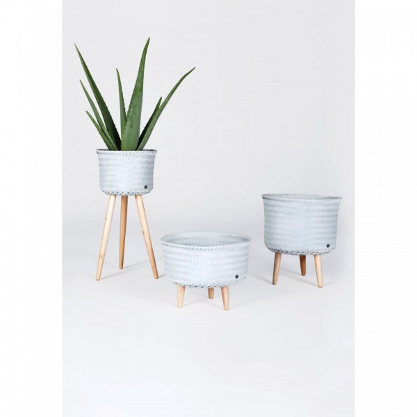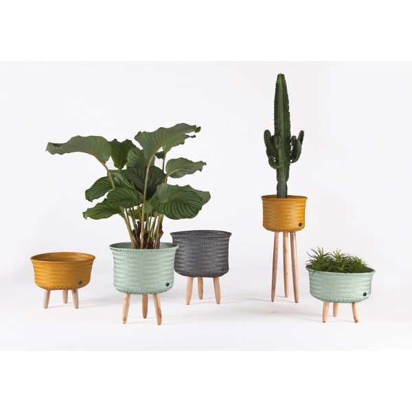 Precioso cesto polivalente hecho con un cesto y tres patas de madera de canela.