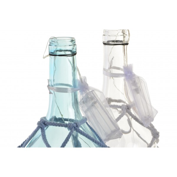 Botella de cristal recubierta de cuerda con hilo de luces LED.