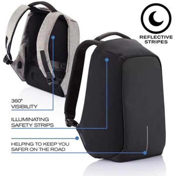 La mejor mochila para los desplazamientos urbanos! Cada día se producen más de 400.000 robos en los bolsos en todo el mundo. Ya no tendrás que preocuparte que te pueda suceder a ti con esta mochila antirrobo Bobby XL! Adecuada para portátiles y tablets de 17 pulgadas 47 x 38 x 17 cm