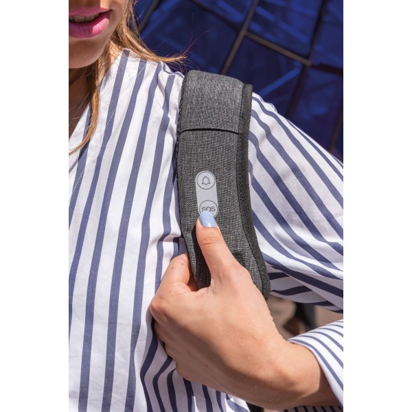 Si sientes una amenaza, Cathy te proporciona diferentes herramientas para ayudarte en esa situación. Al presionar un botón situado en el asa de la mochila, se dispara una fuerte alarma que asustará a tu agresor y llamará la atención de otras personas.