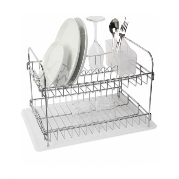 Escurreplatos doble acabado en níquel cromo. Incluye bandeja para recoger el agua y escurridor para los cubiertos.