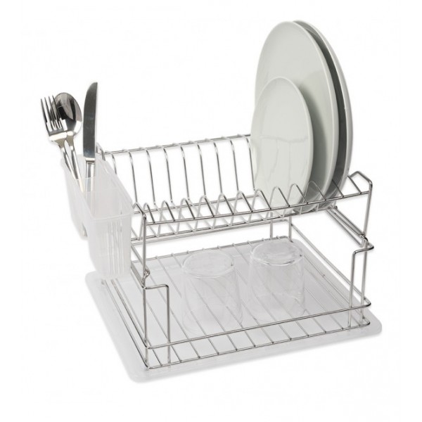 Escurreplatos doble acabado en acero inoxidable. Incluye bandeja para recoger el agua y escurridor para los cubiertos. Se desmonta en dos piezas para almacenarlo.