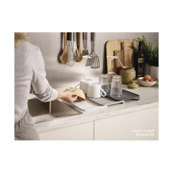 Superficie escurridora ajustable Crea más espacio para escurrir Escurreplatos abatible con una capacidad máxima de 6 platos llanos Se pliega hasta quedar plano para una almacenaje compacto Canales escurridores que canalizan el exceso de agua directamente en el fregadero Base antideslizante Lavar y secar a mano 2.4 x 40 x 31.9 cm