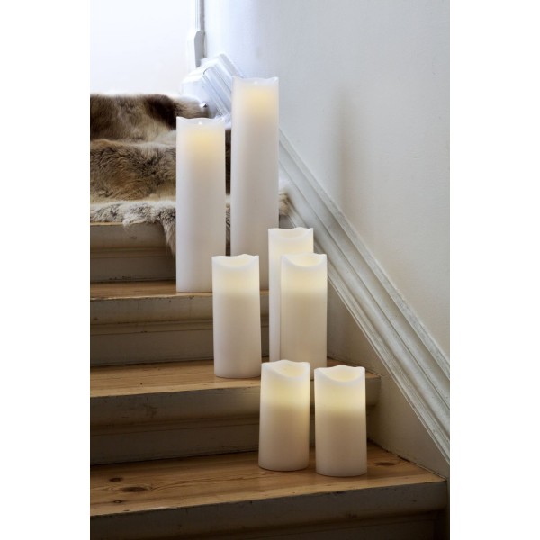 Están hechas de cera real y la luz interior tintineante da el efecto de una vela gastada, encendida. Las velas funcionan con pilas y se pueden programar con la función de temporizador integrada durante 4 u 8 horas de tiempo de iluminación.