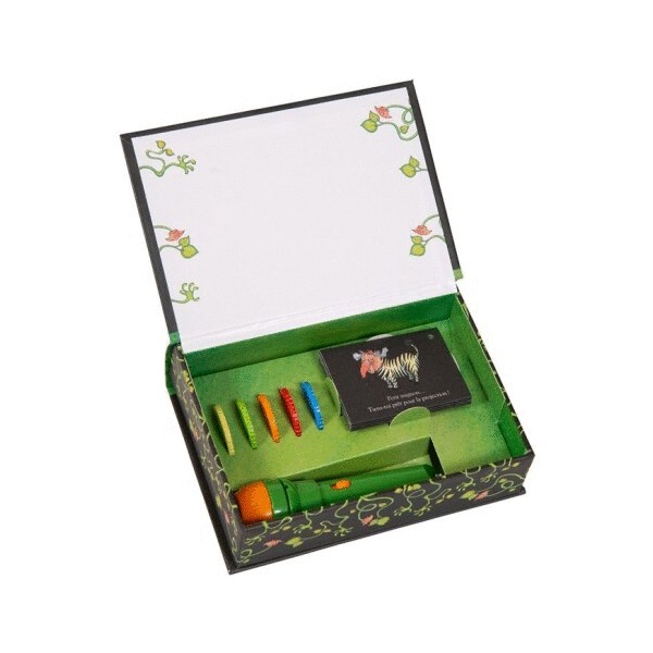 La clásica linterna para proyectar historias de Moulin Roty, ahora en caja regalo La parte interna de la tapa se utiliza como pantalla de proyección Hermosa caja con forma de pantalla de cine 5 discos incluídos No recomendado para menores de 3 años Dimensiones: 19 x 26 cm Tarjetas de invitación en mini sobres
