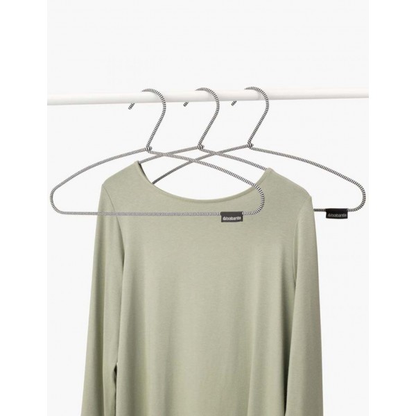 Clips fáciles de abrir, con recubrimiento suave y antideslizante para no dañar las prendas. Los enganches del clip pueden ajustarse al ancho de cualquier falda o pantalón, simplemente deslizándolos por la barra de acero inoxidable de la percha.