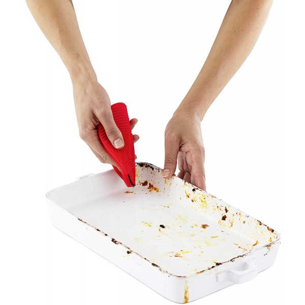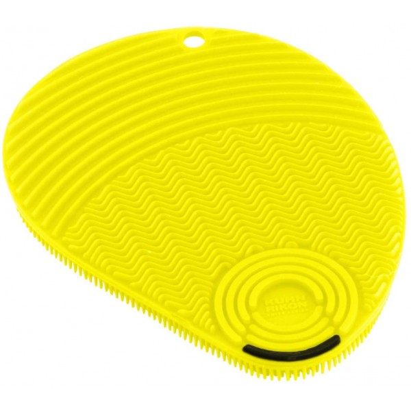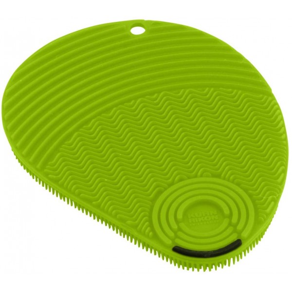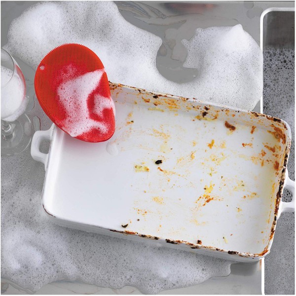 Las rayas texturizadas de silicona en la parte posterior facilitan la limpieza de restos de comida rebeldes de platos y sartenes. El panel frontal, que consta de más de 1,500 cerdas de silicona, es perfecto para lavar platos delicados, como vasos o revestimientos antiadherentes. Gracias a su práctico orificio, la esponja se puede colgar para su secado y almacenamiento.