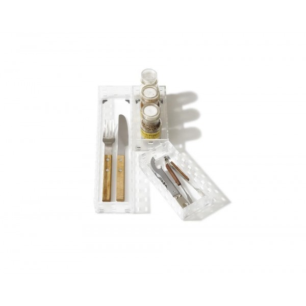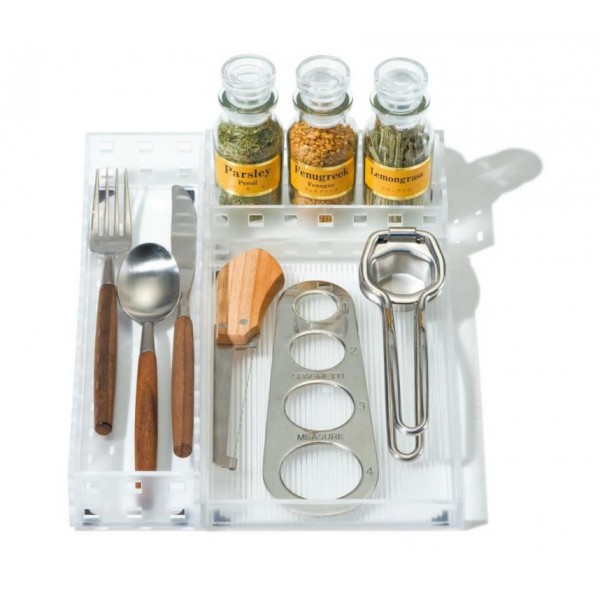 Bandeja extraíble de goteo Atractiva forma circular de gran capacidad Gran capacidad con 3 compartimentos y 2 separadores Contorneado para depositar los utensilios en posición vertical Acero inoxidable. Apto lavavajillas Medidas: 15 x 14,5 x 15,5 cm