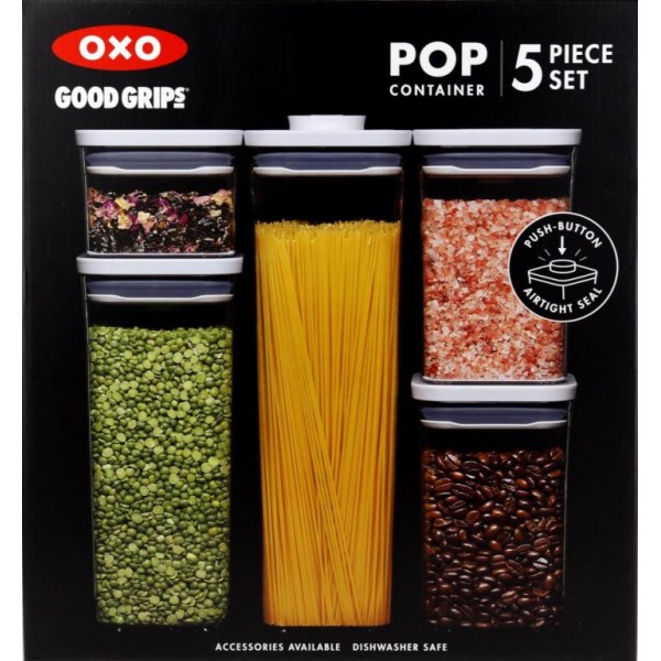 El juego de recipientes POP de 5 piezas es hermético, apilable y ocupa poco espacio, lo que facilita mantener sus alimentos secos frescos y su despensa organizada.