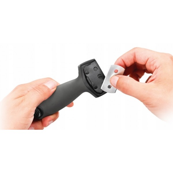 Raqueta universal con cuchilla intercambiable y funda protectora. Para la limpieza de placas de vitrocerámica e inducción, además de hornos. Se recomienda lavar a mano y secar al aire.