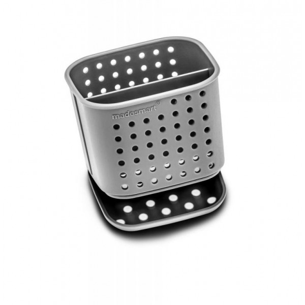 Bandeja extraíble de goteo Forma elíptica para acomodar a la pared ocupando menos espacio Gran capacidad con 3 compartimentos y 2 separadores Contorneado para depositar los utensilios en posición vertical Acero inoxidable. Apto lavavajillas Medidas: 21,3 x 12 x 16 cm.
