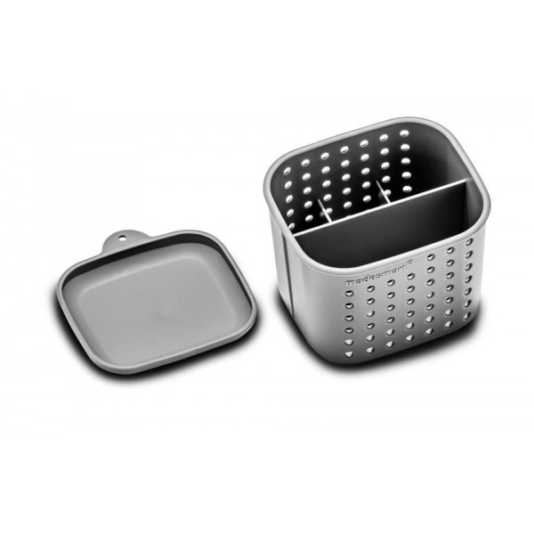 Bandeja extraíble de goteo Atractiva forma circular de gran capacidad Gran capacidad con 3 compartimentos y 2 separadores Contorneado para depositar los utensilios en posición vertical Acero inoxidable. Apto lavavajillas Medidas: 15 x 14,5 x 15,5 cm