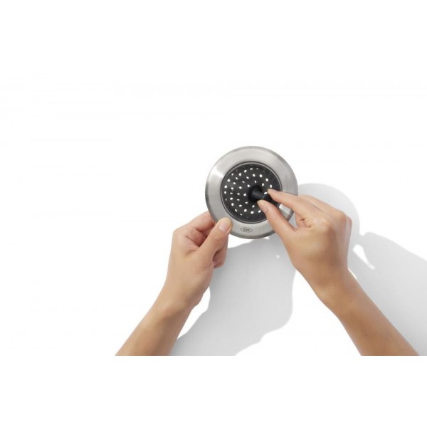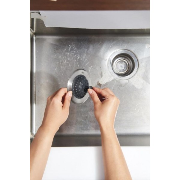 Girando la lengüeta se abre y cierra el tapón para dejar platos o cacerolas en remojo Filtro de silicona flexible que permite estirar para limpiar los residuos Atrapa residuos eficazmente Silicona en la base del aro de acero inoxidable para no rayar el fregadero Resistente a las manchas y fácil de limpiar Apto lavavajillas Medidas: 3,7 x 11,3 x 19,2 cm