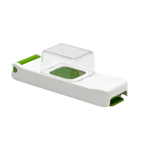 Todo integrado en una sola unidad Cuchillas de acero inoxidable endurecido ultrafino Plástico ABS reforzado y duradero apto para uso alimenticio 100% libre BPA Fácil y seguro de utilizar Protector para los dedos de máxima seguridad Apto lavavajillas - Grosor de corte ajustable: de 1 a 9 mm - Corte juliana y patatas fritas: 3 y 9 mm