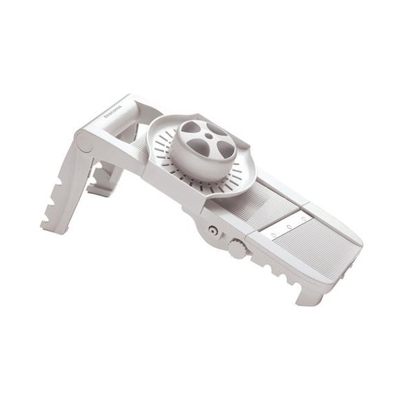 Preciso corte en "V" regulable en grosores de 1 a 9 mm Gire el pomo regulador a la izquierda o derecha para un corte en juliana de 6 mm o de 9 mm Carro protector para su seguridad Patas plegables para guardar de forma compacta o utilizarla encima de un Bowl 7 tipos de corte y un exprimidor acoplable Función lisa, ondulada, rallador, juliana y exprimidor