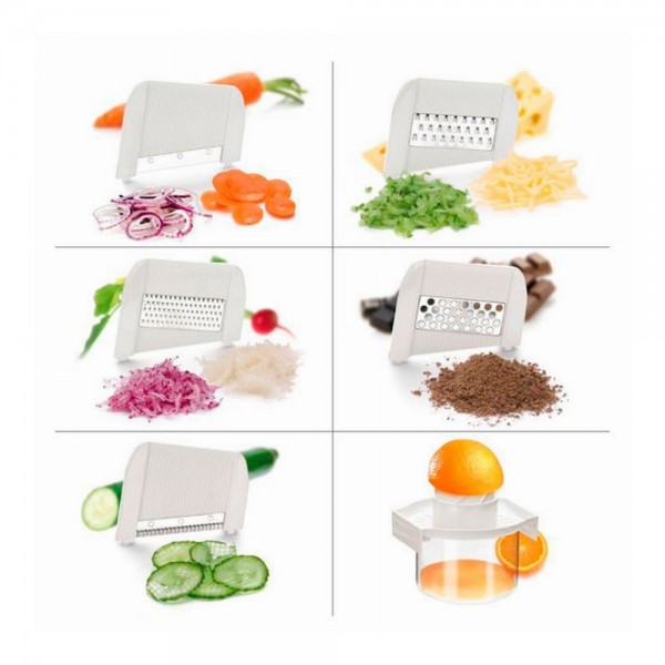 5 cuchillas intercambiables ( lisa, ondulada, y 3 grosores de rallador)