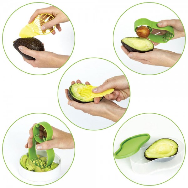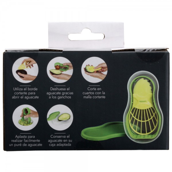 Consta además de un recipiente para guardar todo o el aguacate que sobre.